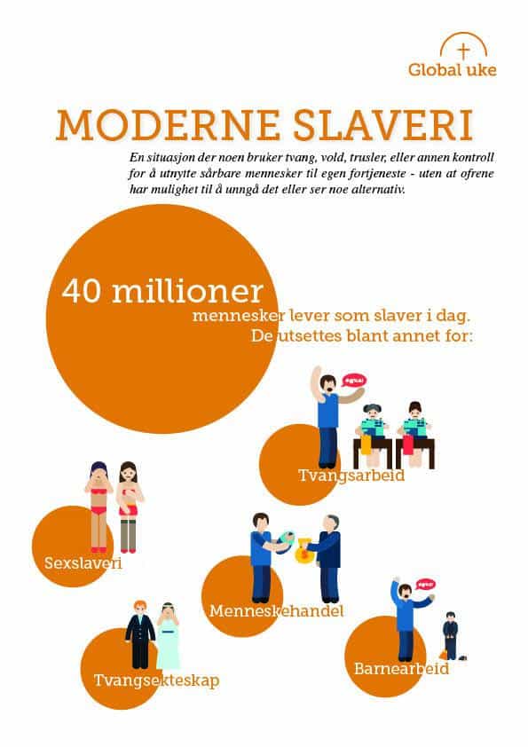 Hvert år arrangerer kirkene i Norge Global uke mot moderne slaveri. Menigheter, grupper og organisasjoner over hele landet vil ha fokus på denne tematikken samtidig.