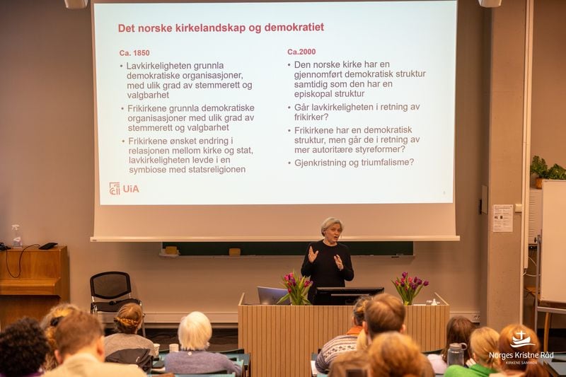 Hun fulgte opp med analyser om deres – og frikirkenes – rolle i demokratiet. Og hvordan vi så fremvekst av styrket demokrati i både lavkirkelige bevegelser, og i frikirkelige. – Lavkirkeligheten grunnla demokratiske organisasjoner med ulik grad av stemmerett og valgbarhet, og har en tydelig demokratisk struktur.