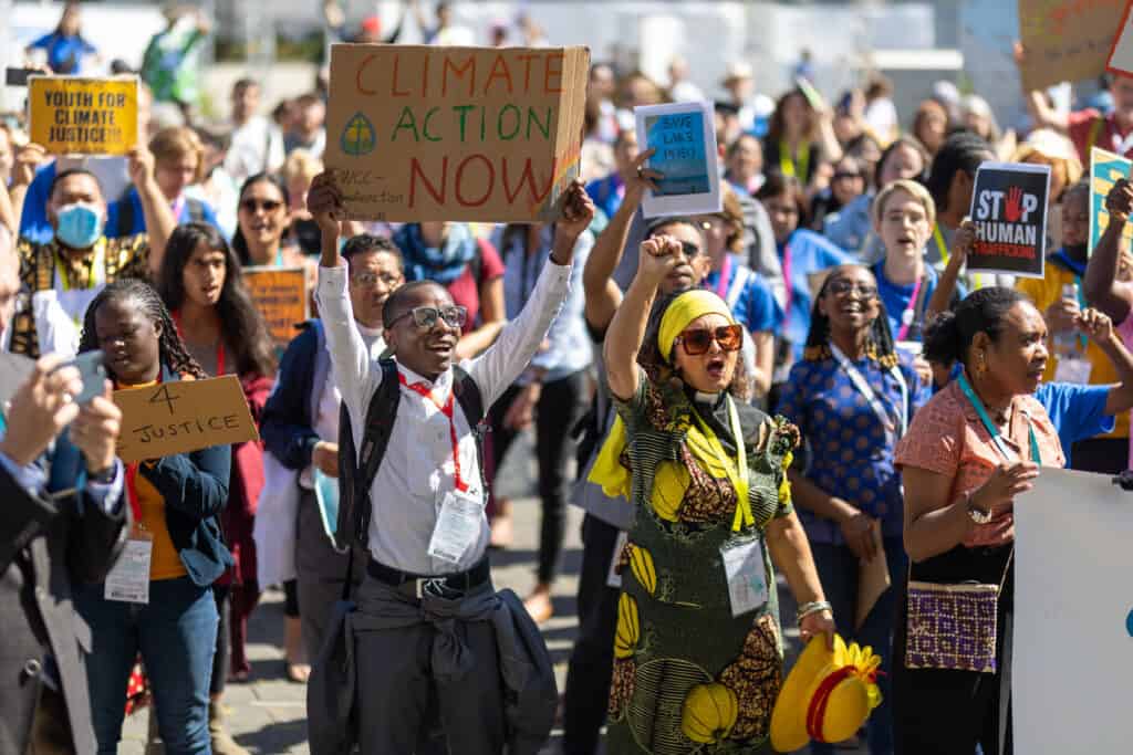Erhard Hermansen forteller at han utenfor hotellet gjentatte ganger blir møtt med ropet fra en gruppe aktivister «We want climate justice, now!», – et rop som er blitt gjentatt gang etter gang under generalforsamlingen, sier Hermansen.