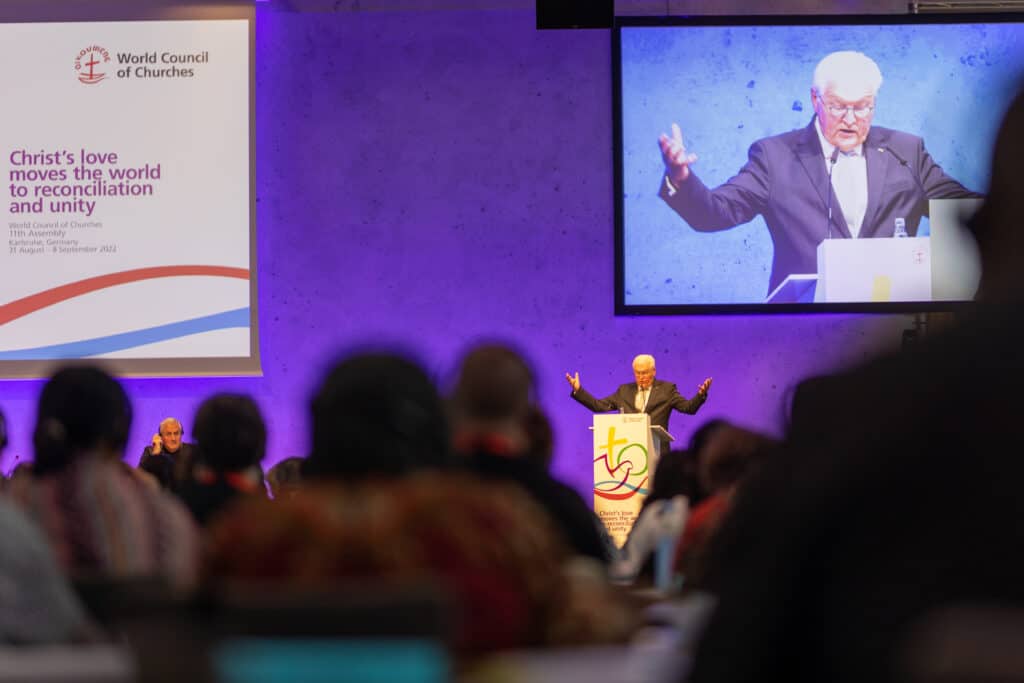 Han la til, – Ja, gang på gang blir kristne kalt til å være brobyggere. Det er og forblir en av våre viktigste oppgaver. Men å bygge broer krever vilje på begge sider av elva; en bro kan ikke bygges hvis den ene siden river ned pilarene som støtter den. I forkant av generalforsamlingen ble det gitt uttrykk for at dialog i det minste burde muliggjøres. Ja, men dialog er ikke et mål i seg selv. Dialog må få frem det som skjer. Dialog skal rette oppmerksomheten mot urettferdighet, skal identifisere både ofre og gjerningsmenn – og deres håndlangere. Likevel kan dialog som ikke går utover fromme ønsker og vage generaliseringer i verste fall bli en plattform for rettferdiggjørelse og propaganda. Hva slags dialog skal vi delta i her? Det er valget denne forsamlingen må ta, og Tysklands holdning – jeg snakker her også på vegne av den føderale regjeringen – er klar, sa president Frank-Walter Steinmeier