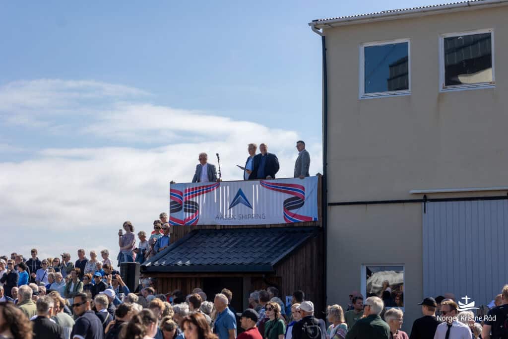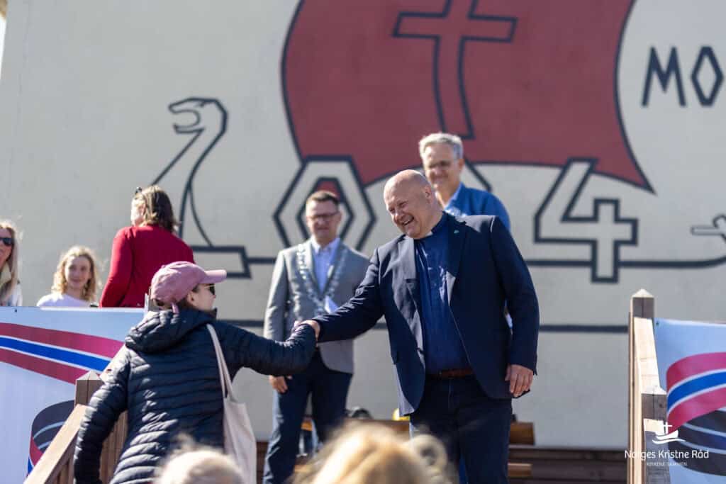 Generalsekretær Erhard Hermansen ønsker pilegrimene fra Christian Radich velkommen til Moster