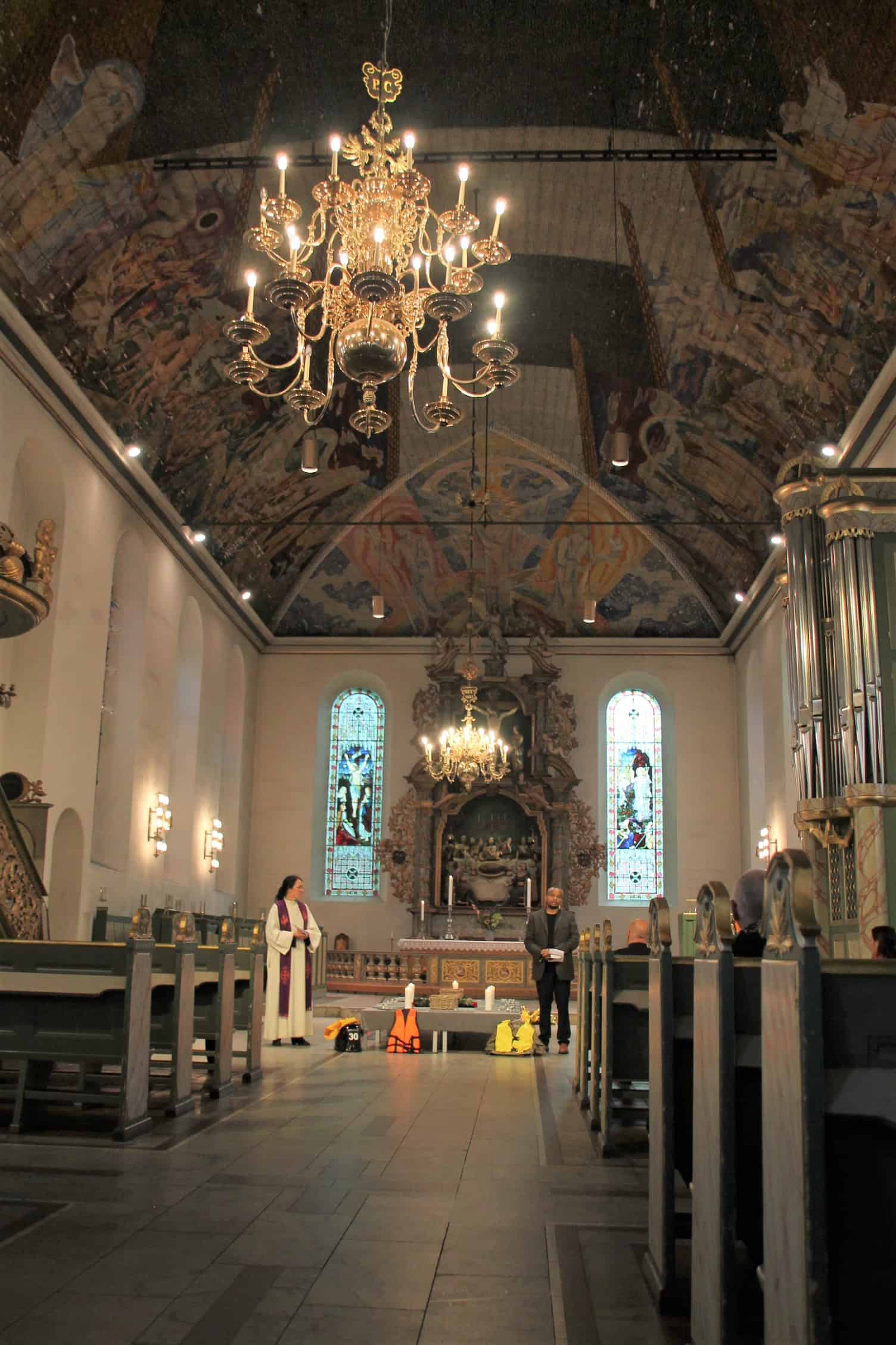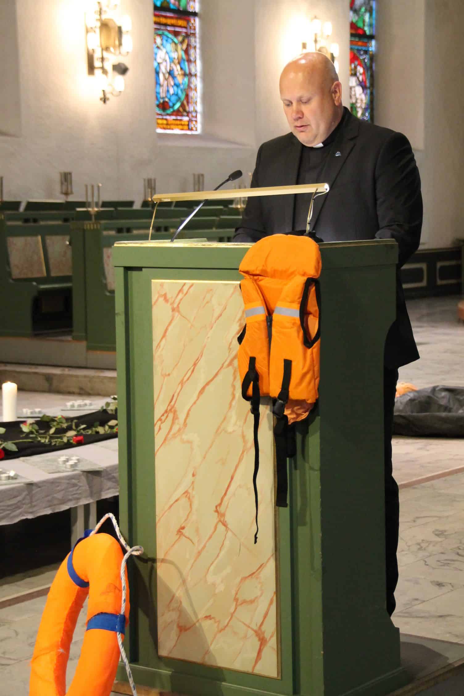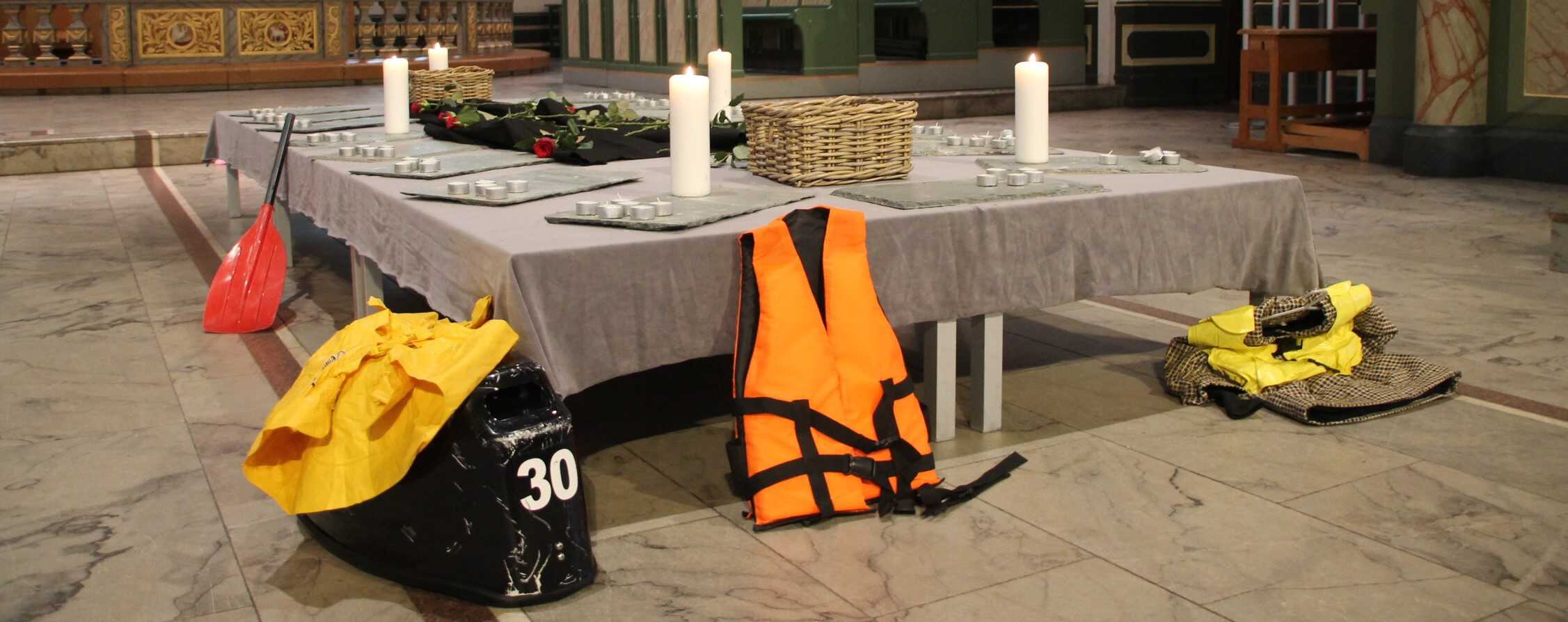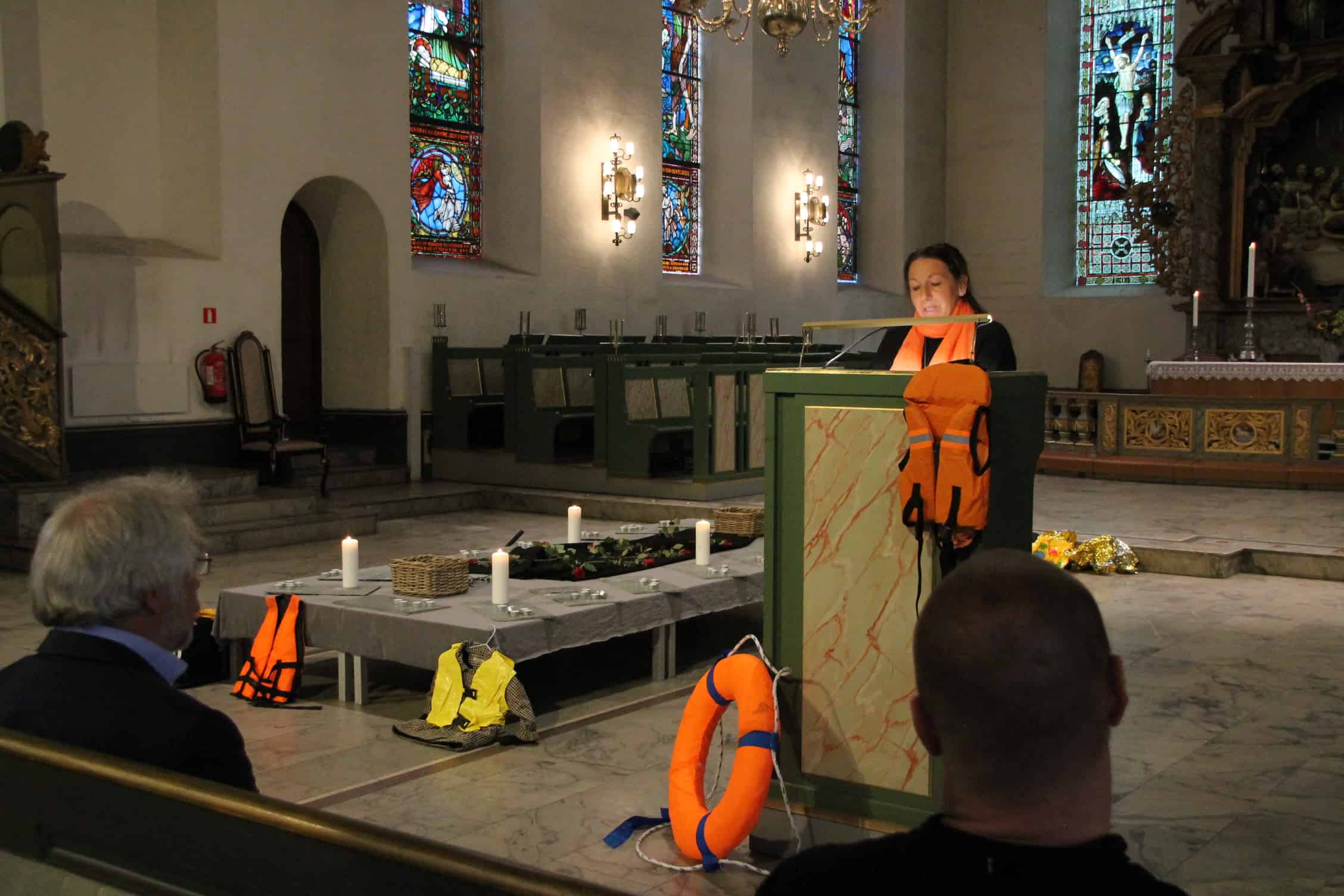Framme i kirken var det laget en platting med lys. Rundt den lå falske redningsvester, en falsk påhengsmotor, en dukke og en livbøye laget av isopor. Vi fikk en sterk appell fra Pål Nesse i Flyktninghjelpen, og Bendik Østbye Johannessen leste diktet «No one leaves their home» av Warsan Shire (Uk/Kenya).