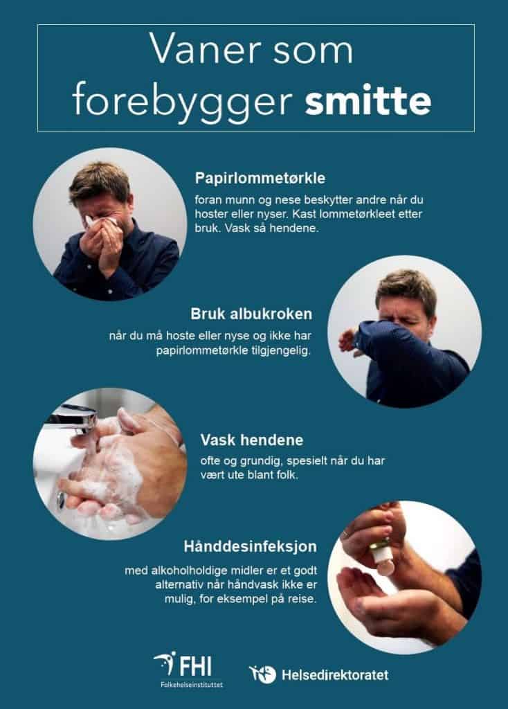 - Hold god håndhygiene, enten håndvask med såpe og vann eller desinfeksjonssprit. Mange har antibac tilgjengelig ved inngangen, som f.eks. butikker – bruk muligheten.
